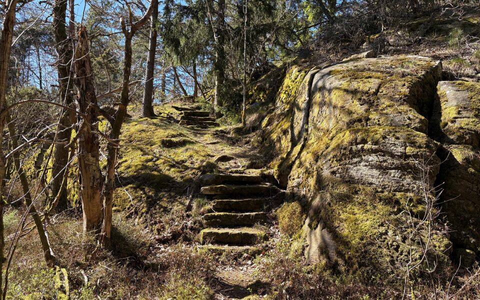 Löst eller halt underlag i kombination med branta partier: Tekniska partier kräver stöd med händerna. Passage över t.ex. höga stättor och längre trappor. Återkommande partier med stenar och/eller rötter. Spänger med djupare omgivande vatten.