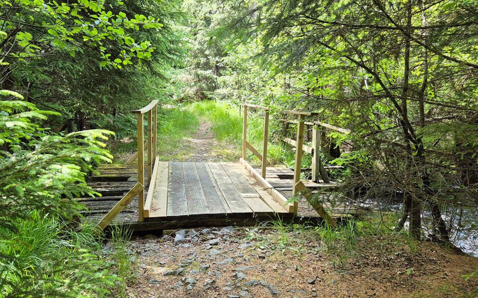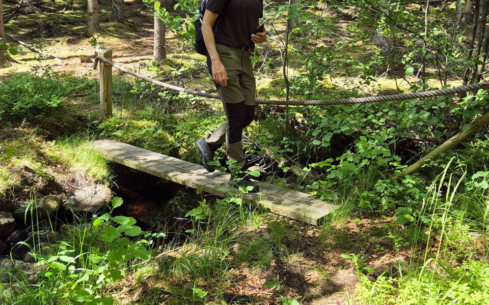 Jämt och fast underlag: Genomgående flack terräng. Vandring utan behov av att ta stöd med händerna. Hinder saknas. Broar finns alltid vid passage över vattendrag.